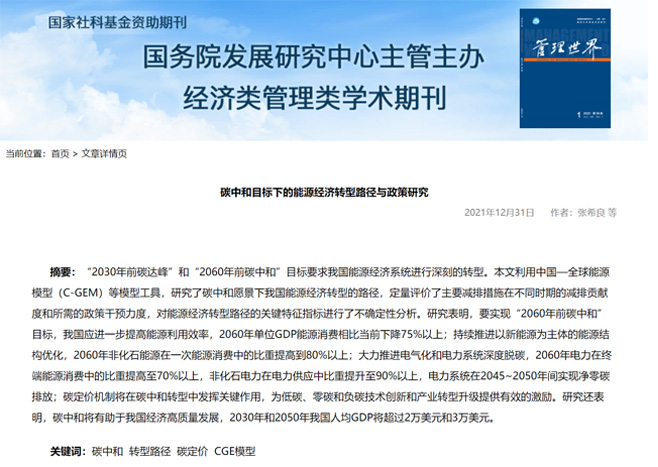 近日,清华大学能源环境经济研究所所长、清华三峡气候与低碳中心主任张希良教授等人在《管理世界》发表题为《碳中和目标下的能源经济转型路径与政策研究》的文章。