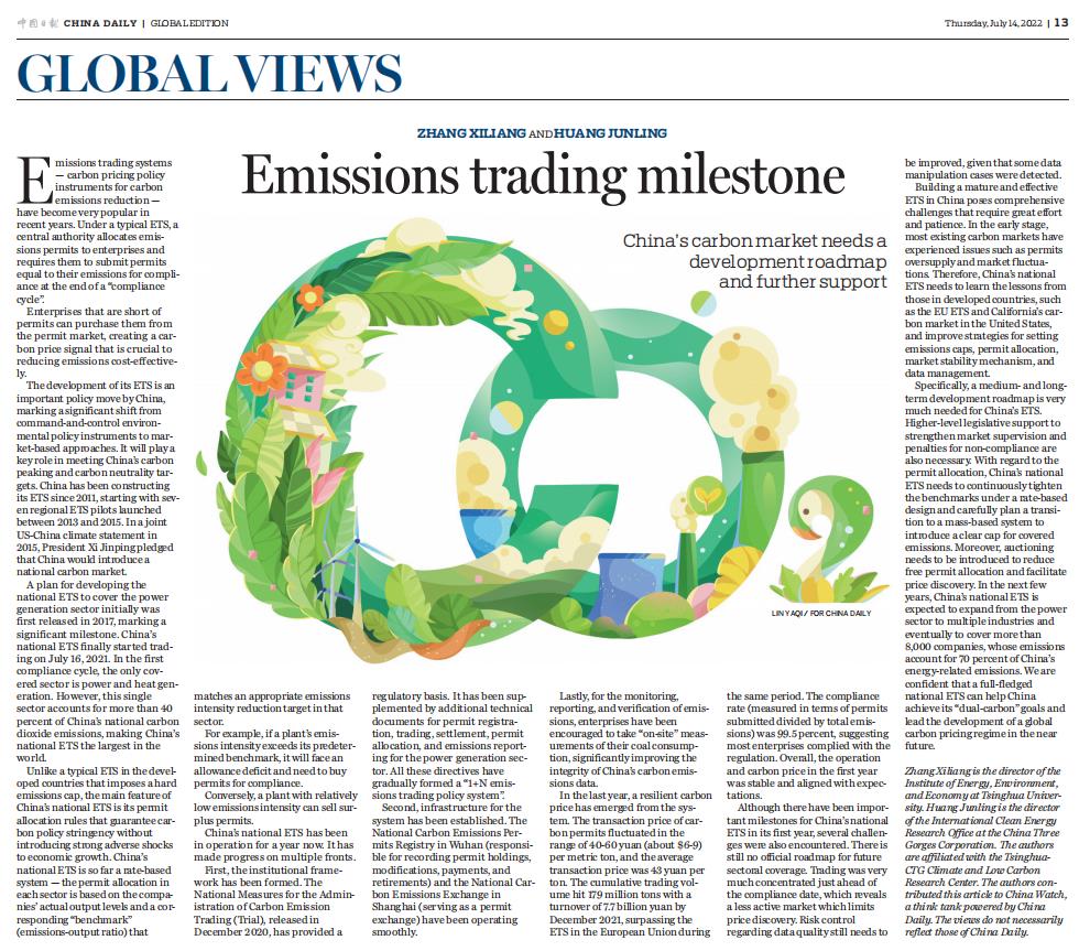 Specifically, a medium- and long-term development roadmap is very much needed for China's ETS.Higher-level legislative support to strengthen market supervision and penalties for non-compliance are also necessary. With regard to the permit allocation, China's national ETS needs to continuously tighten the benchmarks under a rate-based design and carefully plan a transition to a mass-based system to introduce a clear cap for covered emissions. Moreover, auctioning needs to be introduced to reduce free permit allocation and facilitate price discovery. In the next few years, China's national ETS is expected to expand from the power sector to multiple industries and eventually to cover more than 8,000 companies, whose emissions account for 70 percent of China's energy-related emissions. We are confident that a full-fledged national ETS can help China achieve its "dual-carbon" goals and lead the development of a global carbon pricing regime in the near future.