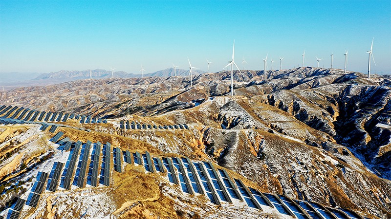 A hybrid wind and solar power station near Zhangjiakou in Hebei province, northwestern China.Credit: Chen Xiaodong/VCG via Getty